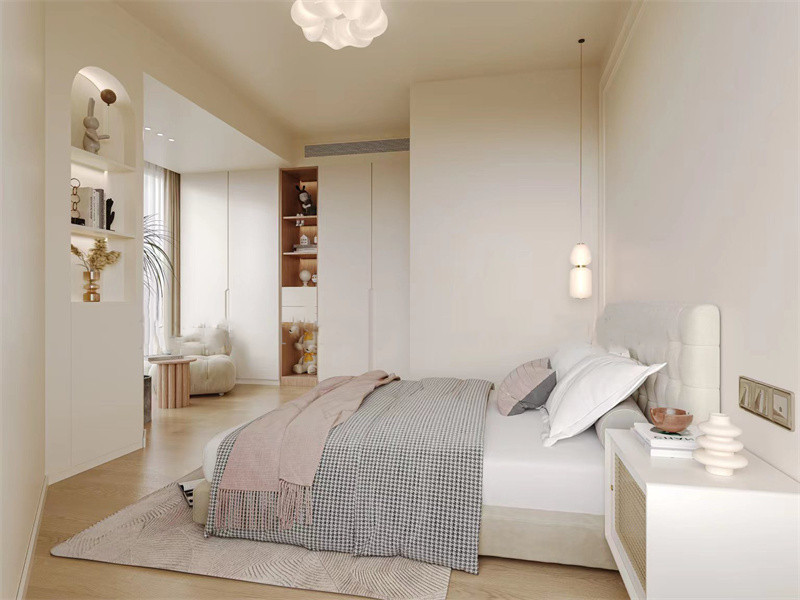 卧室以白色为主色调,搭配浅灰、淡粉,营造出清新柔和的睡眠环境,空间布局合理,整体呈现简约又温馨。