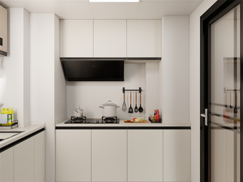 以白色为主色调,搭配黑色线条勾勒,简洁利落。U型布局合理利用空间,吊柜与地柜提供充足收纳,墙面挂杆方便厨具取用,让烹饪操作更便捷。