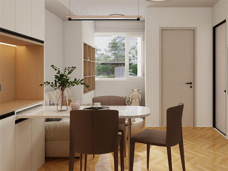 延续整体温馨简约的基调,圆形餐桌搭配棕色餐椅,营造舒适就餐氛围。餐边柜满足收纳与展示需求,开放格设计方便放置常用物品。与客厅过渡自然,整体和谐统一。