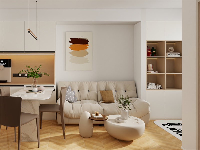 主打温馨舒适的奶油风,浅色系贯穿空间,木质人字拼地板提升温暖感。沙发造型柔软蓬松,搭配圆润茶几,营造放松氛围。艺术挂画和绿植点缀,让空间充满生活气息与艺术感。