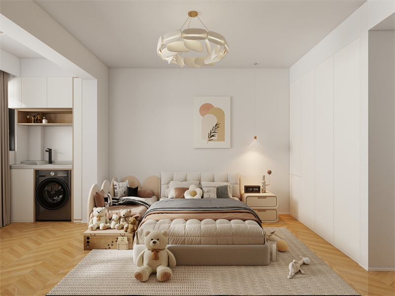 浅色调营造柔和氛围,弧形元素运用让空间更灵动。大床与小床的组合满足亲子需求,丰富的毛绒玩具增添童趣。角落嵌入洗衣区,实现空间多功能利用。