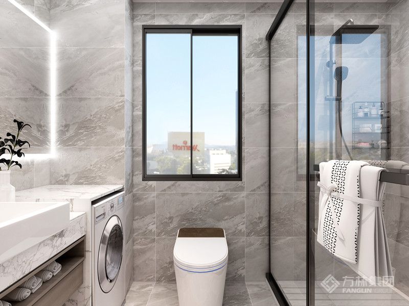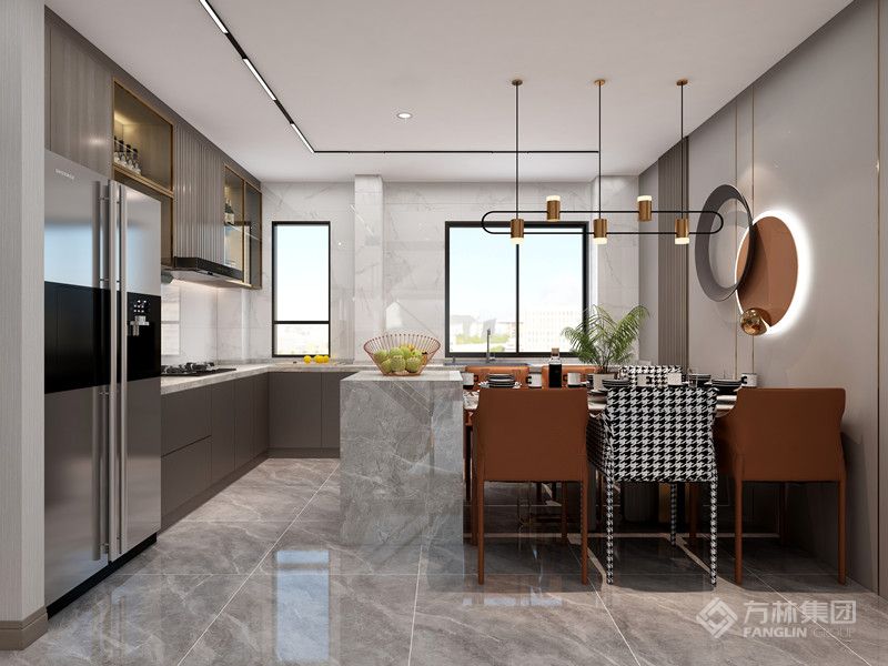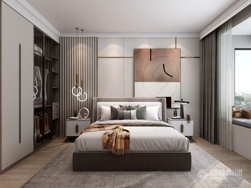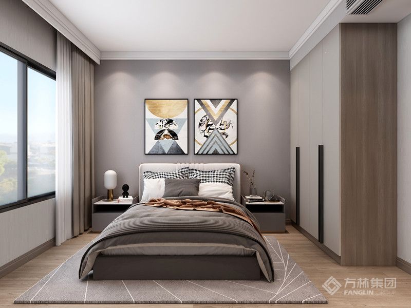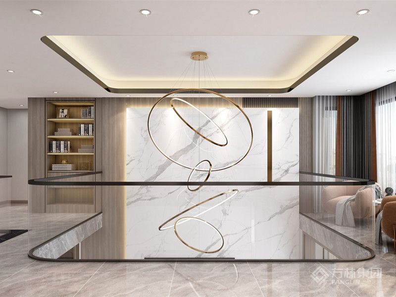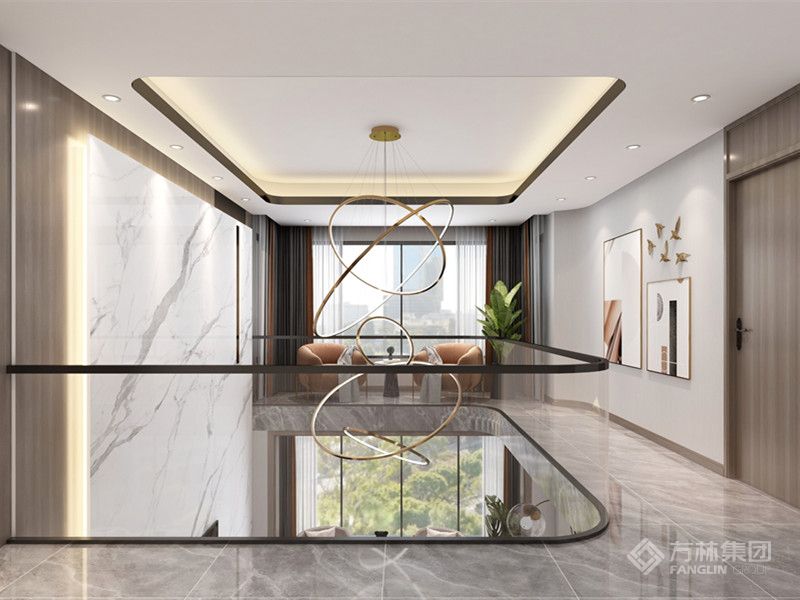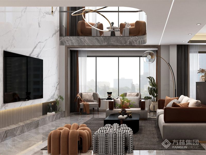整体色调采用经典的现代风格,胡桃木色搭配灰色。电视背景墙采用胡桃木色墙板搭配白色理石来凸显空间的明亮与大气。