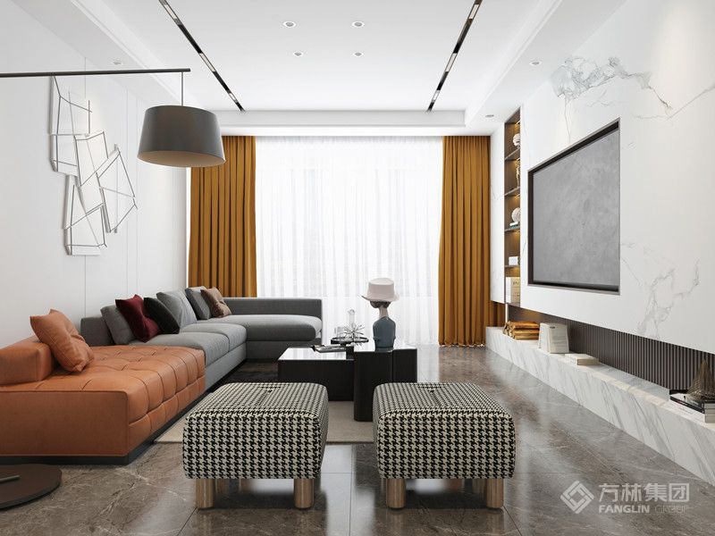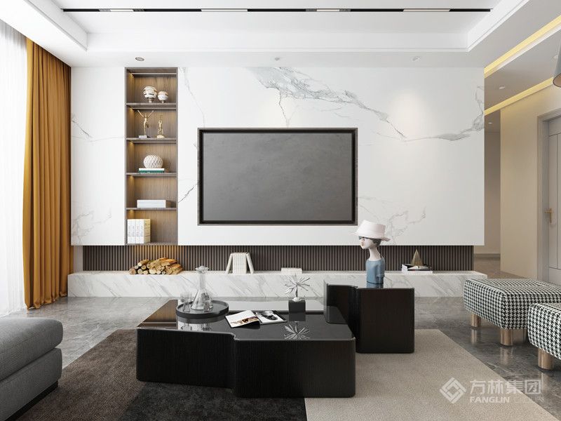 整体色调采用经典的现代风格,胡桃木色搭配灰色。电视背景墙采用胡桃木色墙板搭配白色理石来凸显空间的明亮与大气。