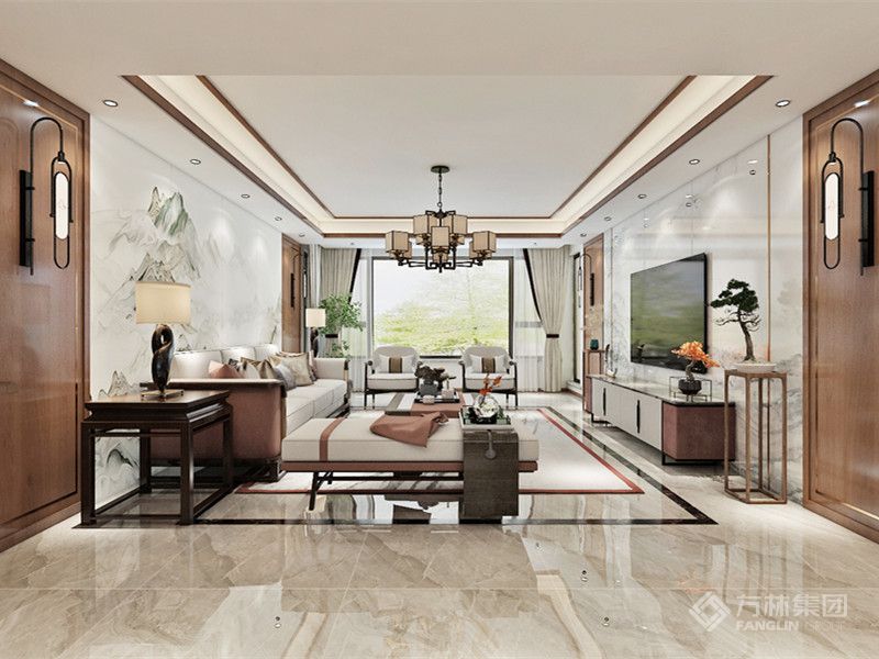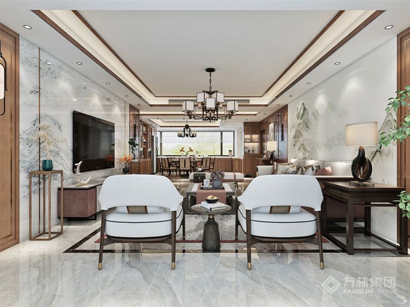 本案以山为背景将中式元素置入室内空间,结合软硬一体化的思路融入其中诠释当代东方气质美学。